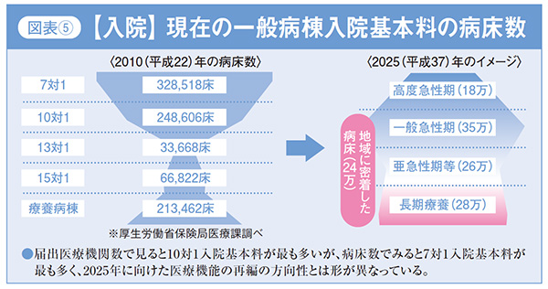 今回の診療報酬改定の狙いは、「医療から介護へ」「施設から在宅へ」という流れをつくることにあるといえます。医療提供体制の改革で在宅復帰を促す誘導策であることは、「【入院】現在の一般病棟入院基本料等の病床数」という厚生労働省の資料を見ても明らかです。2025年に向けた医療機能の再編の方向性が示されています。(図表5)